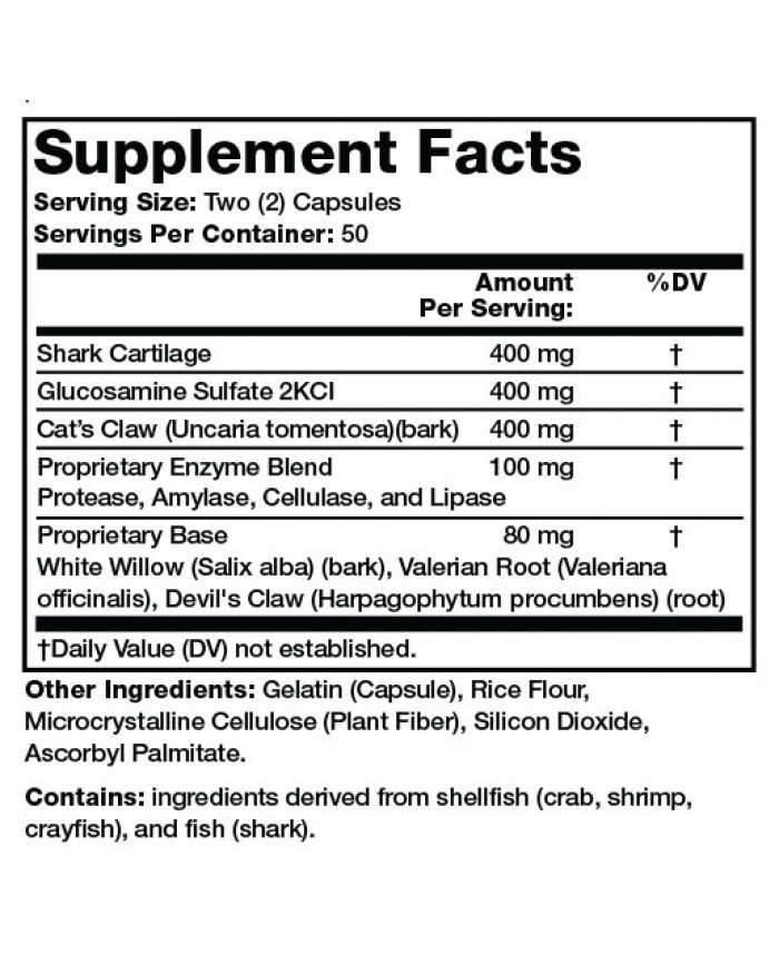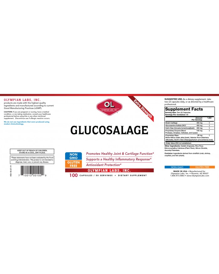 Olympian Labs Glucosalage S04 Extra Strength powerful formula contains a unique combination of Shark Cartilage (a natural source of chondroitin sulfate), Glucosamine Sulfate, and Cats Claw, along with added enzymes to support healthy joints.
