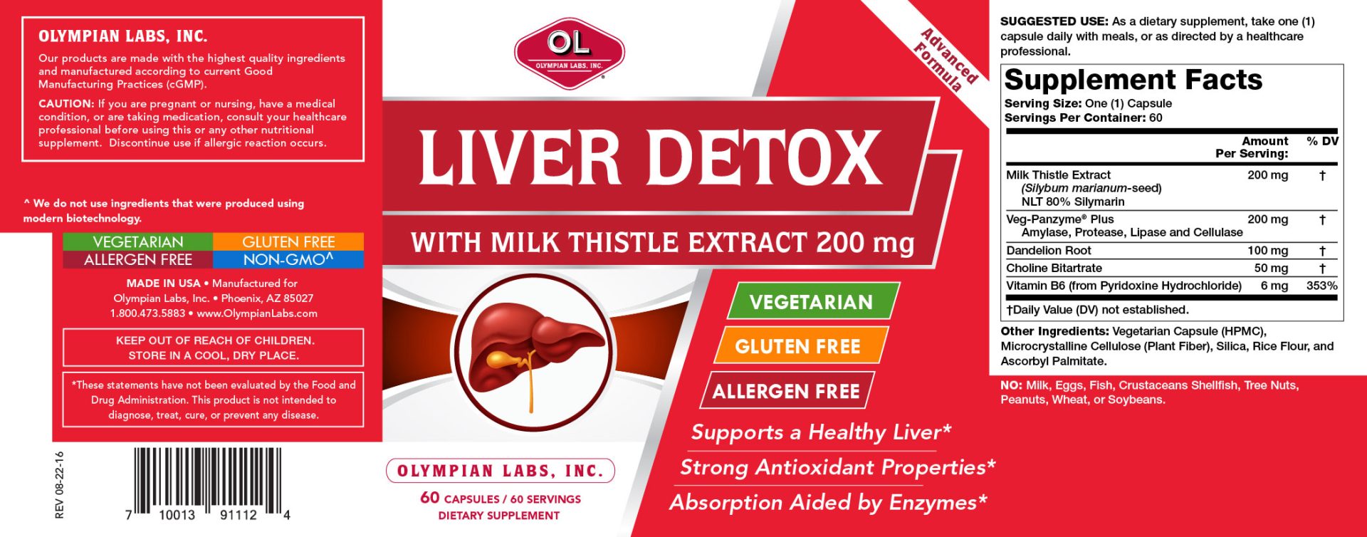 Olympian Labs Liver Detox advanced formula is a specialty blend of Milk Thistle, Dandelion Root, Choline Bitartrate, & Vitamin B6 to support a healthy liver. Uniquely created with Veg-Panzyme Enzymes (Amylase, Protease, Lipase & Cellulase) for increased absorption.