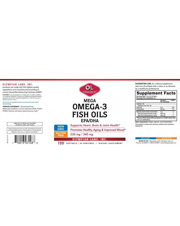 Olympian Labs Mega Omega-3 contains a high dose of 530 mg EPA and 340 mg DHA. EPA and DHA are key ingredients to help support heart health, mood, and cognitive ability. In addition to heart and cholesterol health, Omega-3 essential fatty acids are essential for nerve function and supporting healthy brain function.