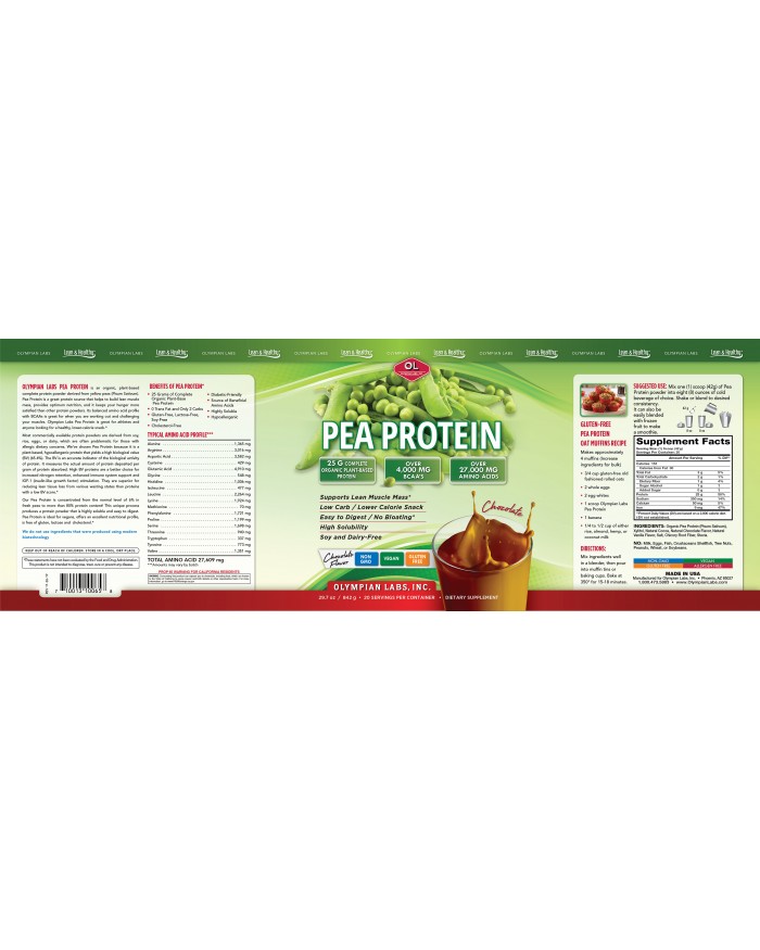 Olympian Labs Pea Protein is an organic, vegetable-based complete protein powder derived from yellow peas (Pisum sativum). Pea Protein is a great protein source that helps to build lean muscle mass, provides optimum nutrition, and it keeps your hunger more satisfied than other protein powders. Its balanced amino acid profile with BCAAs is great when you are working out a lot and challenging your muscles.