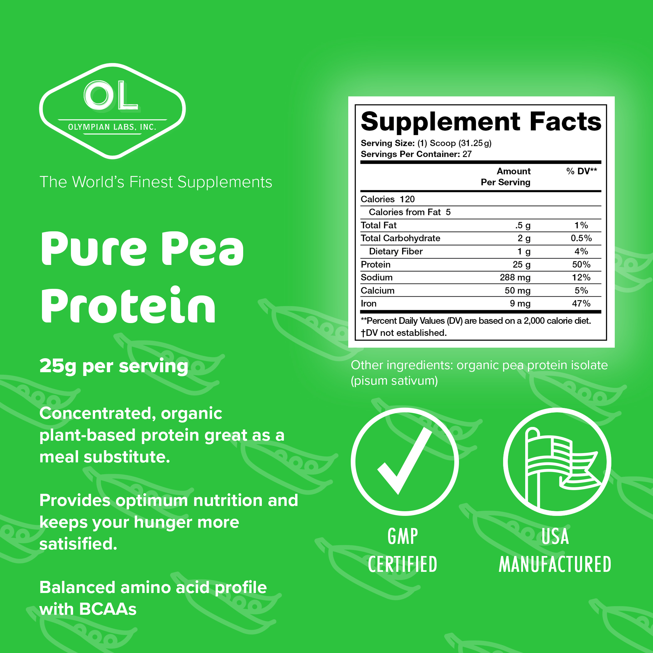 Olympian Labs Pea Protein is a vegetable-based complete protein powder derived from yellow peas (Pisum sativum). Pea Protein is a great protein source that helps to build lean muscle mass, provides optimum nutrition, and keeps your hunger more satisfied than other protein powders. Its balanced amino acid profile with BCAAs is great for intense workouts and challenging your muscles.