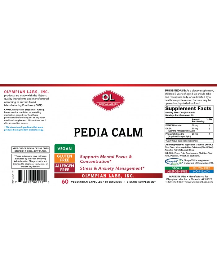 Olympian Labs Pedia-Calm contains Phosphatidylserine, DMAE and GABA. The natural ingredients in this formula work to support focus and concentration.