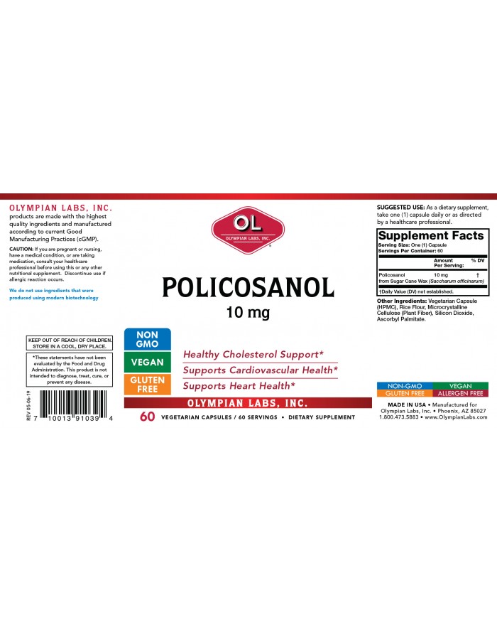 Policosanol by Olympian Labs is an all- natural supplement derived from sugar cane supporting Cardiovascular Health