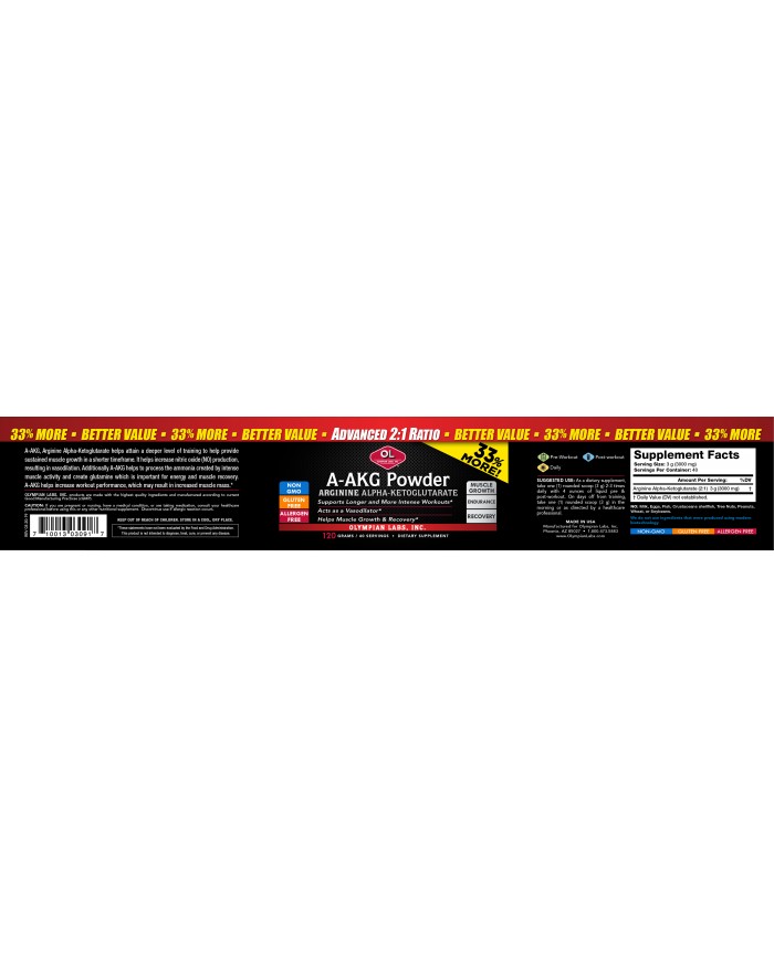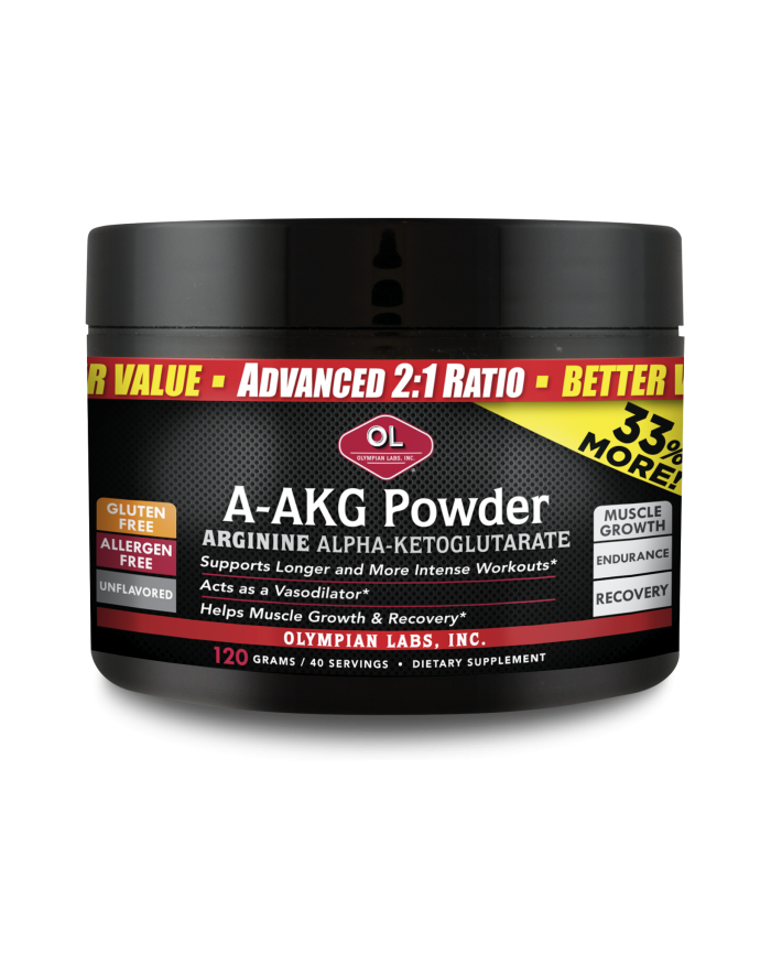 Olympian Labs Arginine (A-AKG) is a pre & post-workout powder that helps attain a deeper level of training, increased muscle pump, and provides sustained muscle growth in a shorter timeframe for post-workout, it helps to process the ammonia created by intense muscle activity and create glutamine which is important for energy and muscle recovery.