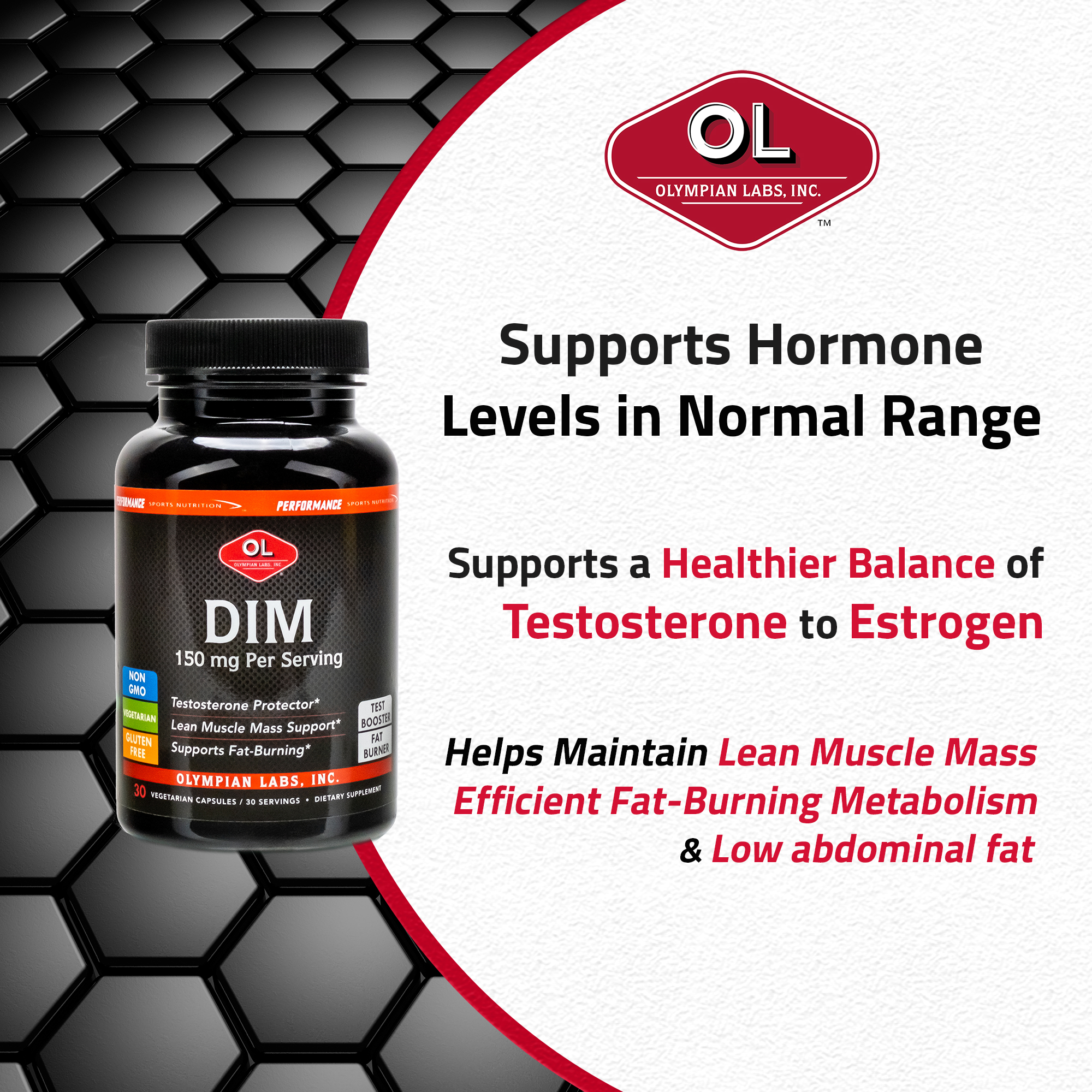 Olympian Labs Diindolylmethane (DIM) helps convert strong and damaging forms of estrogen into weaker forms so your testosterone is protected from harmful estrogen and your balance of testosterone to estrogen ratio is supported.