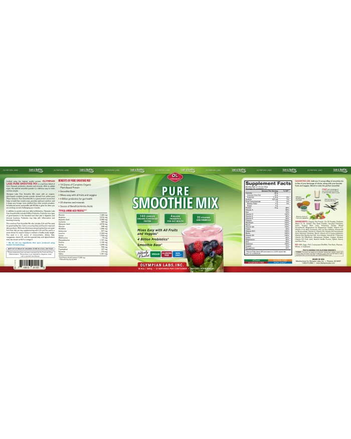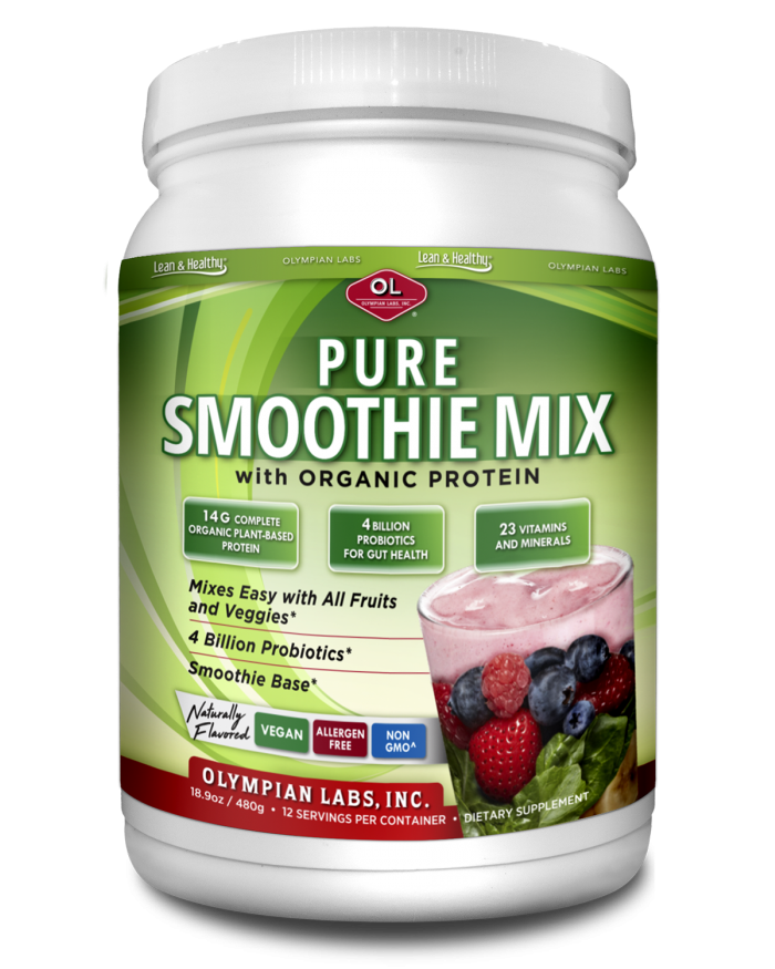 Olympian Labs Pure Smoothie Mix with Organic Protein is a protein based powder packed with vitamins, minerals, probiotics, CLA and Flax Seed. Our powder is easily mixed in with any smoothie for a delicious way to make nutrition simple.