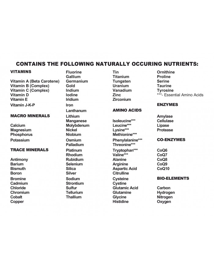 Sea Nourishment contains vitamins, macro minerals, trace minerals, amino acids (including essential amino acids), and enzymes in a perfect balance to support digestive health and to cleanse and detoxify the body.