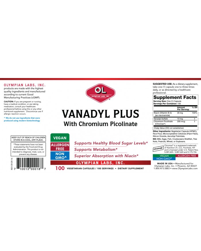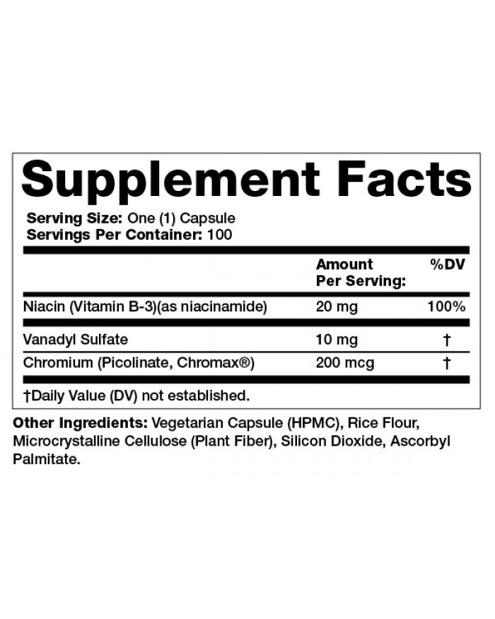 Olympian Labs Vanadyl Plus combines two key ingredients – Vanadyl Sulfate and Chromium Picolinate. Niacin has also been added to aid in superior absorption.